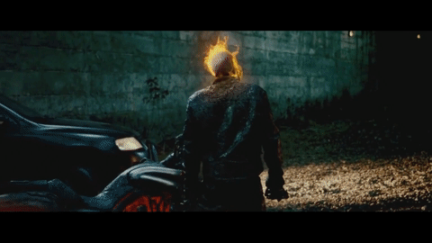 The spirit of vengeance hosted by danny ketch comes out of the wreckage on a bike with flaming wheels to match the hellfire on ghost riders skull. The ground shakes and a light pours from the junkyard as the assassins throw grenades into the wreckage. He touches the medallion on the bike.